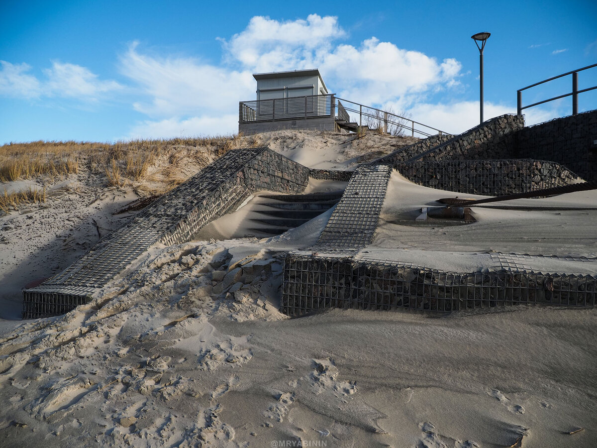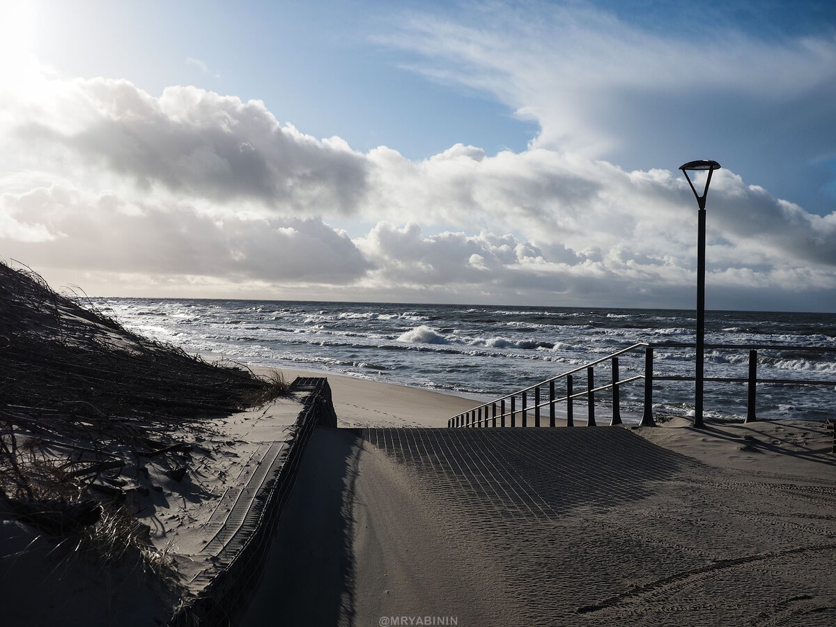 Вот, например, выходы к пляжам. С одной стороны хорошо, что в Литве можно гулять по пляжам на Куршской косе, с другой стороны, наверно так хуже для природы. Впрочем, если сделать все с умом и ограничить хождение по дюнам, как это сделали в Литве, то наверно можно все сделать и для людей, и для природы. Ой, я же о плохом… Посмотрите, как засыпаны песком ступени лестницы — Черт ногу сломает! Ужасно. Не убрано. Зачем вливать деньги в строительство, если потом за этим не ухаживать!