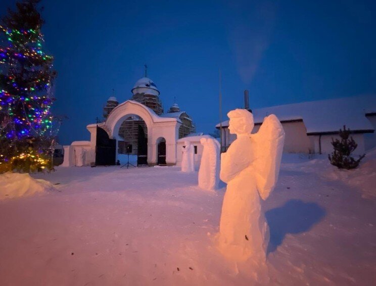 Тут как раз на первом фоне тот ангел, которого мы вытесали из снега. А там дальше другие семьи делали. А слева большая снежная гармонь, которую наверняка покажут в передаче.