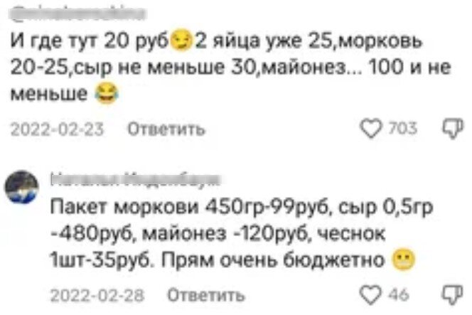 В комментариях сильно ругались на автора ролика, который обманул, сказав, что салат получается недорогой, якобы в пределах 20 рублей. Почитатели домашней готовки определили его как "буржуйский", так как: