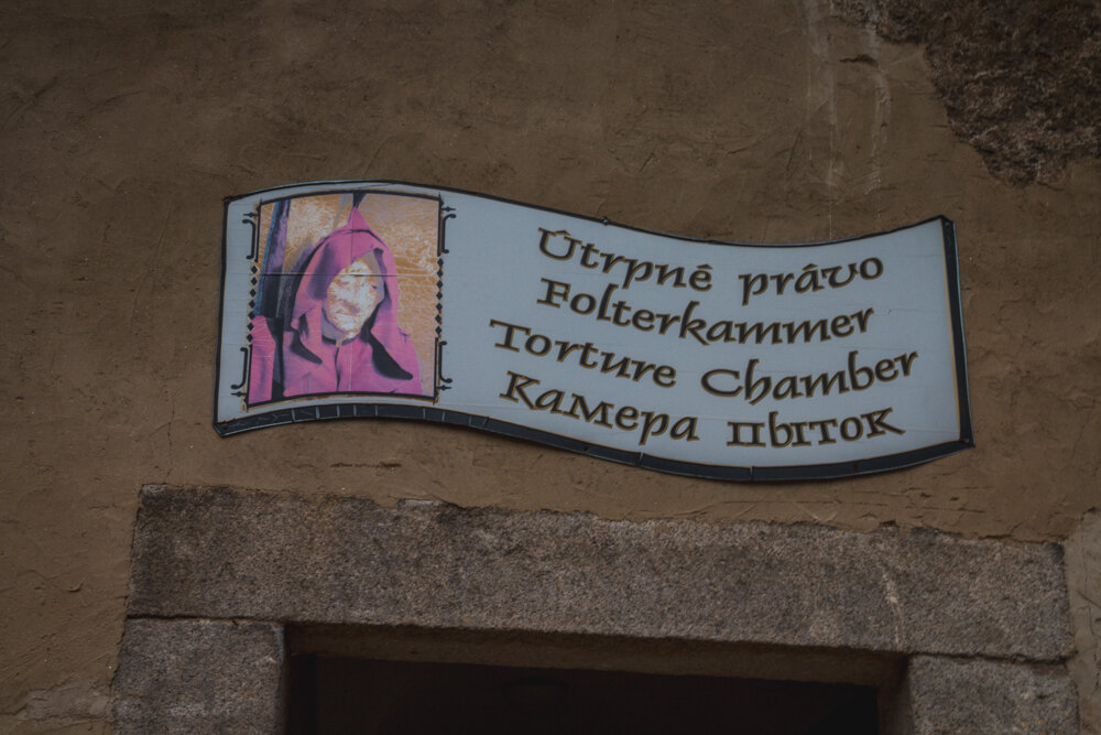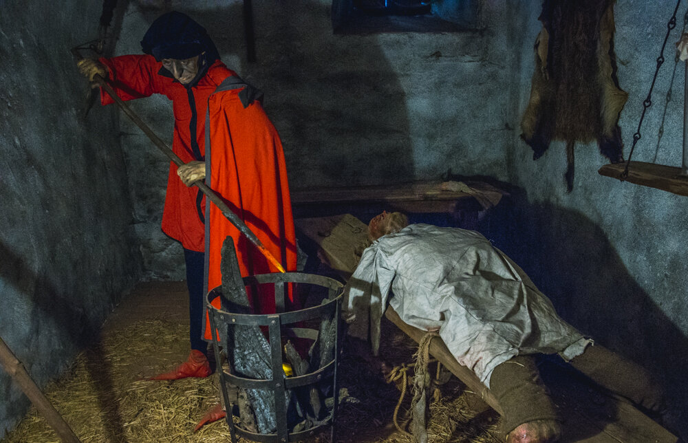 Этот гениальный ход придумали здешние власти. Камера пыток — не одно помещение, как можно подумать, а настоящие застенки и казематы, спрятанные в подвалах под замком. Все экспонаты камеры выполнены очень искусно, иногда их трудно отличить от живых людей.