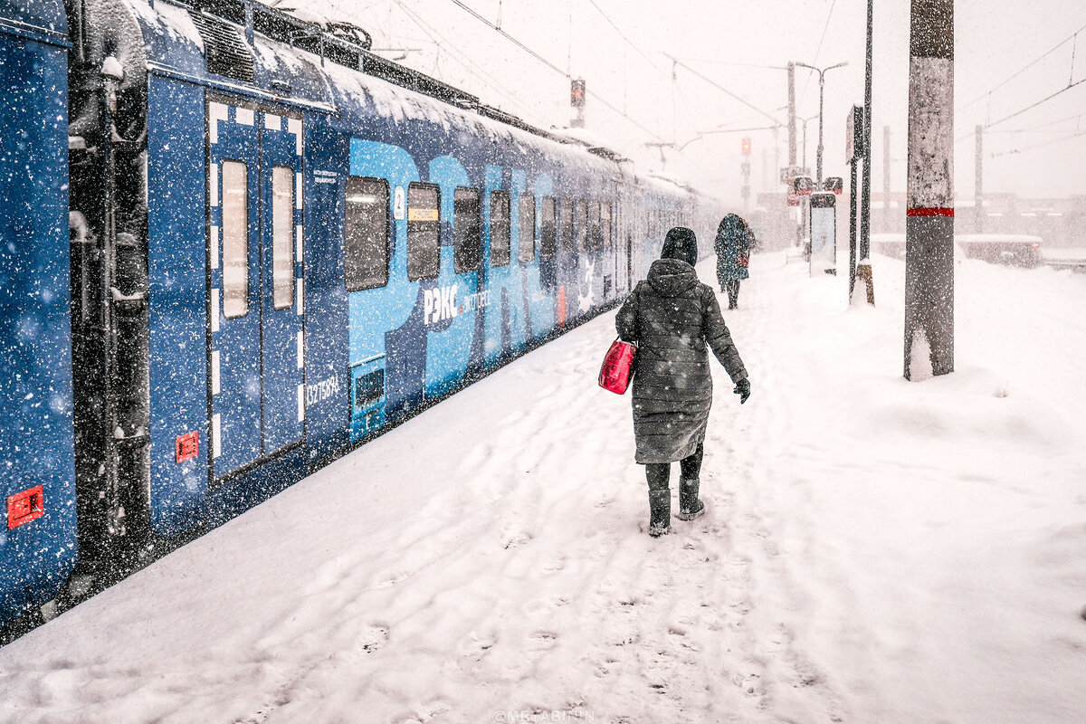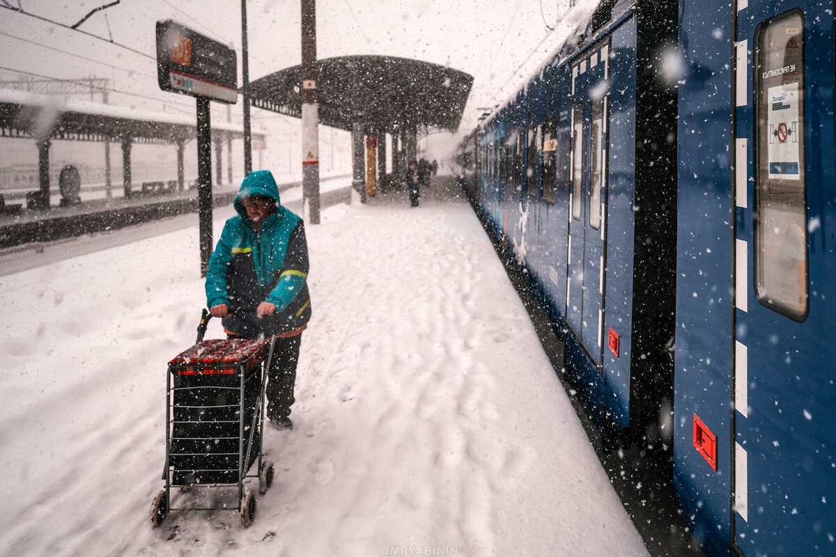 Если про людей, тогда ниже… Когда уже смотрел отснятый материал, то вспомнил кадр нашей советской фотографической классики — Аркадия Шайхета "На промысел в Москву". Чуть ниже покажу его. Смотрел на идущих в снежную мглу людей и аналогия сама проявилась… Хотя, не скрою, что надпись на вокзале "Москва" была включена мной в кадр специально.