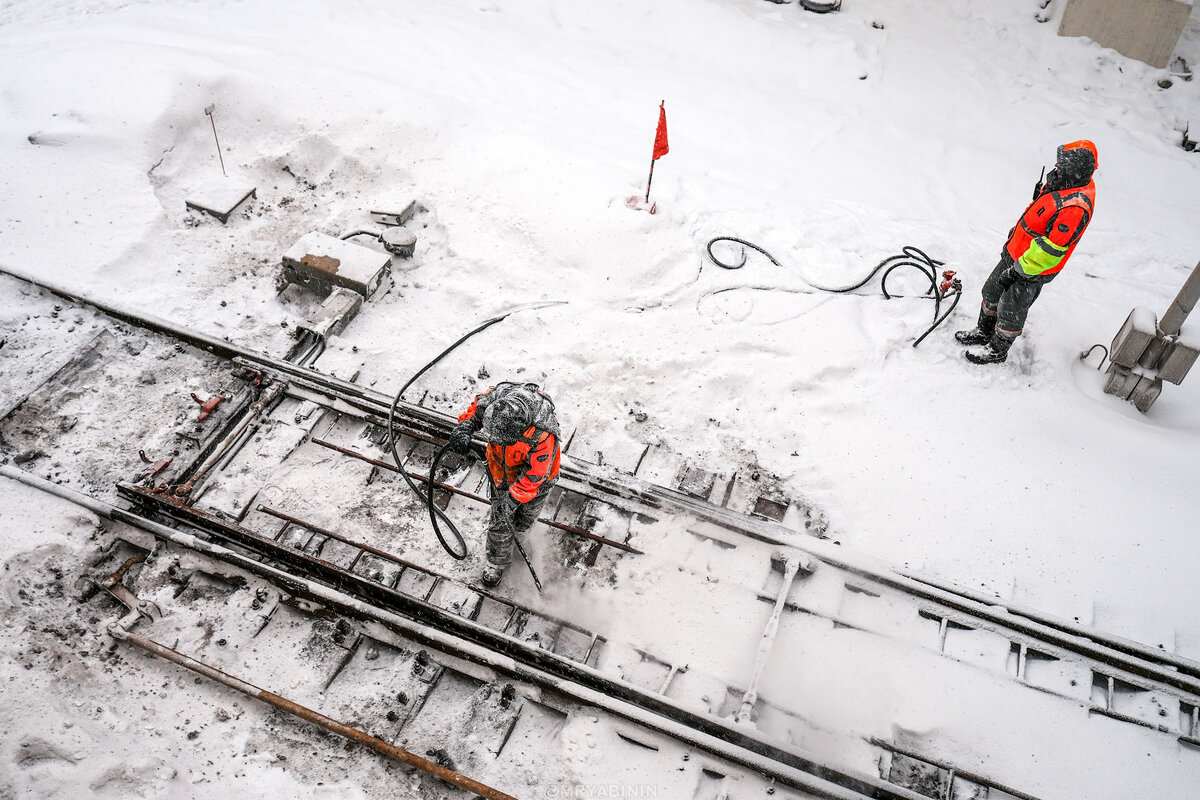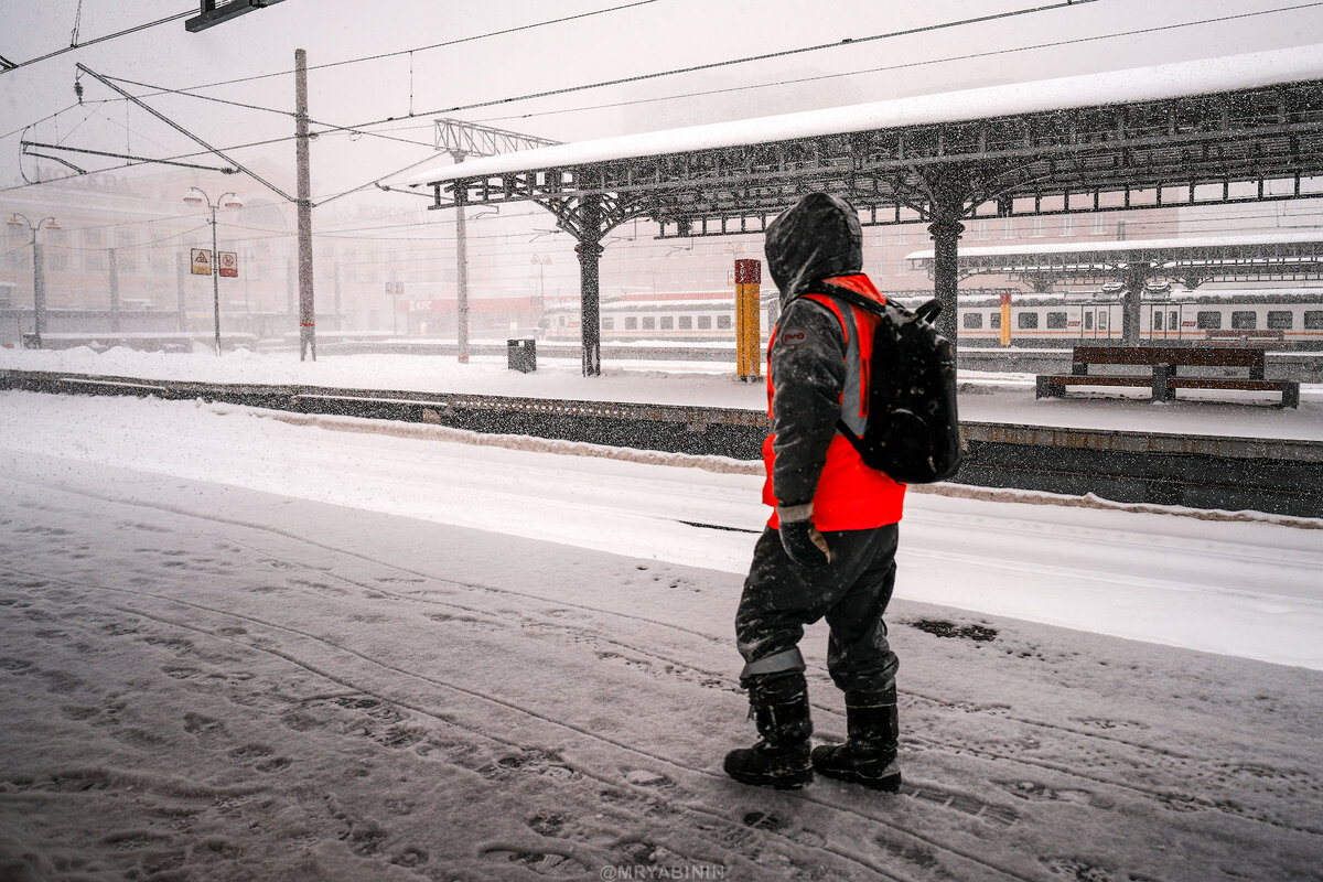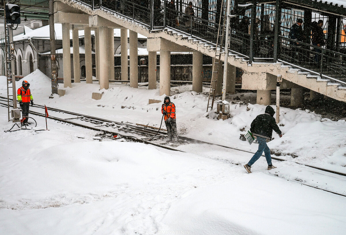 Ну и закончу рассказ о сегодняшней прогулке с фотоаппаратом уже почти без снега, но тоже забавными кадрами с людьми. Тут хорошо видно, что завалило так завалило, что приходится стрелки вручную очищать на станциях.