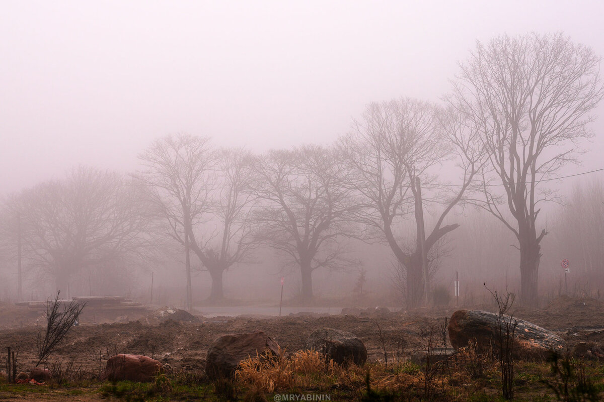 Там, где стройка еще не закрыла высокий берег, еще можно увидеть красивую картину стоящих на краю деревьев. Когда построят комплекс апартаментов, то такой картины в туман будет уже не увидеть. Ловите мгновение!
