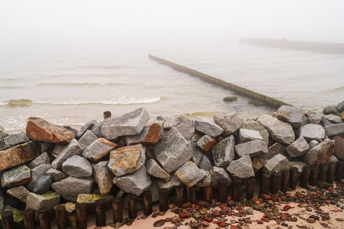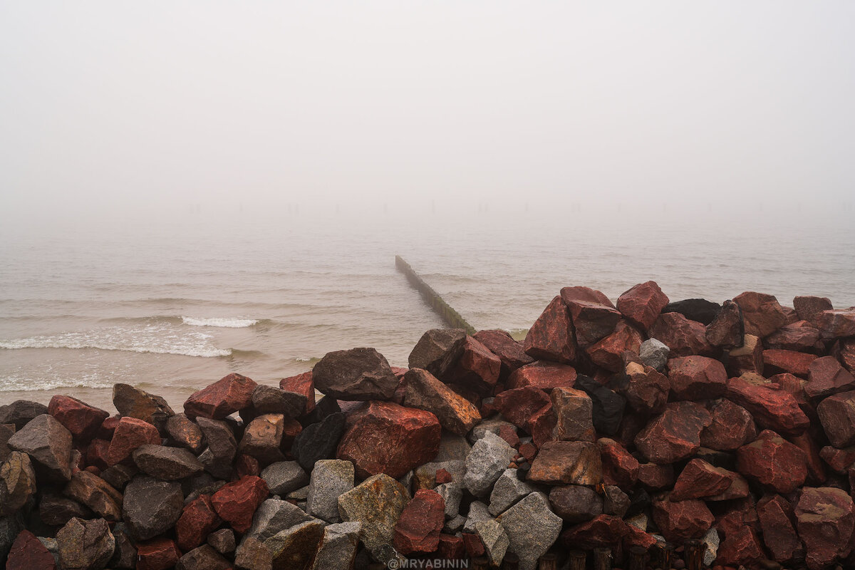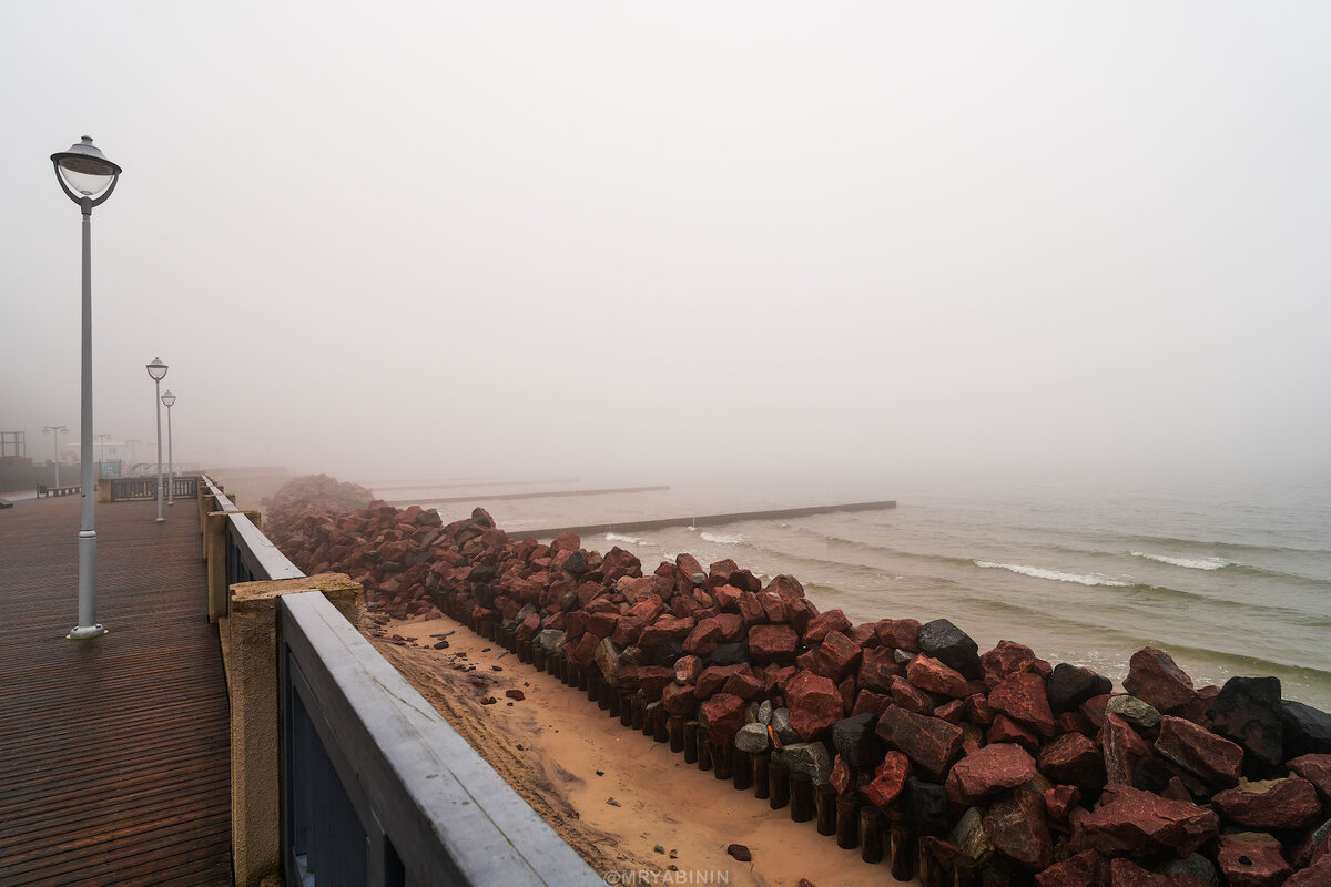 Поняв, что туман уходить не собирается — я отправился на променад снимать море, которое скрывалось уже в паре десятков метра от береговой линии. Вдоль променада Светлогорска насыпали целый вал камней, чтобы защитить его от штормовых волн.