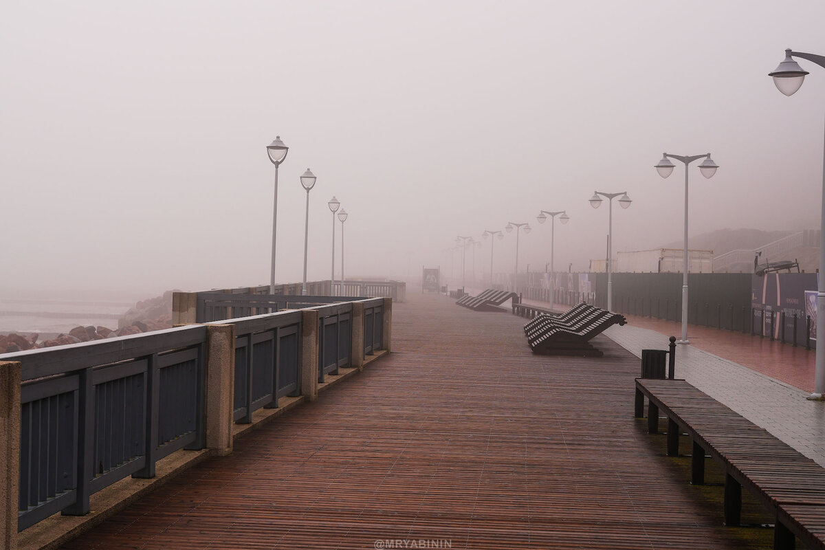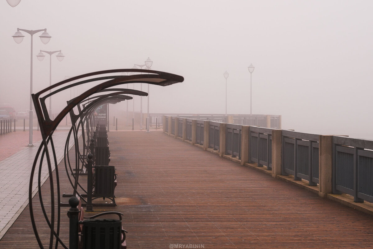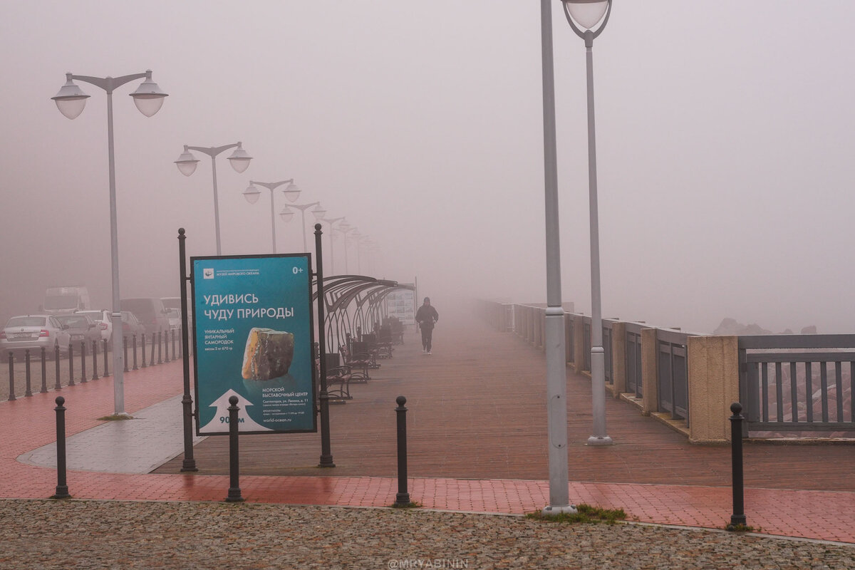 Приветливый в солнечную погоду променад Светлогорска с десятками лавок и шезлонгов, в "молоке" выглядит довольно угрюмо и звук, кажется, затихает всего в паре метров от тебя, а море почти не шумит, увязнув в густом тумане.
