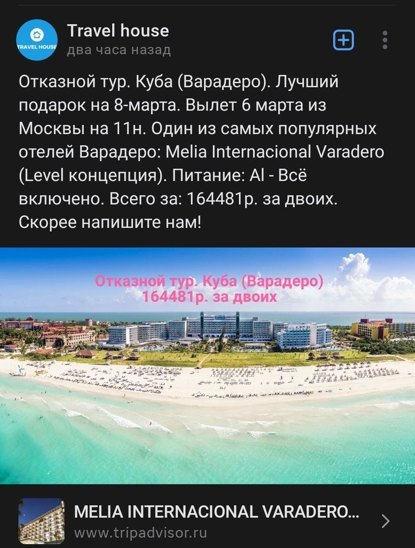 Исходная история находится тут. Мария была подписана на группу Вконтакте, где предлагались туры. Название группы — Travel House. Nур на Кубу на 11 дней на двоих там предлагался всего за 165 тыс. руб., c доплатой за ребенка – за 204 тыс. В других местах аналогичные путевки стоили дороже. Такая низкая цена объяснялась тем, что это якобы отказной тур. То есть люди не поехали и вот теперь как будто попросили турагента продать тур хотя бы и со скидкой — чтобы вернуть часть денег.