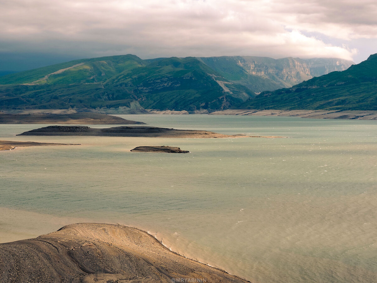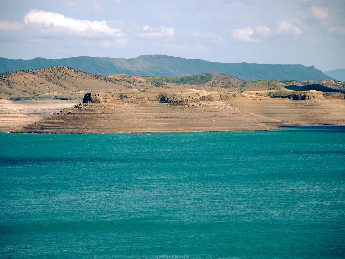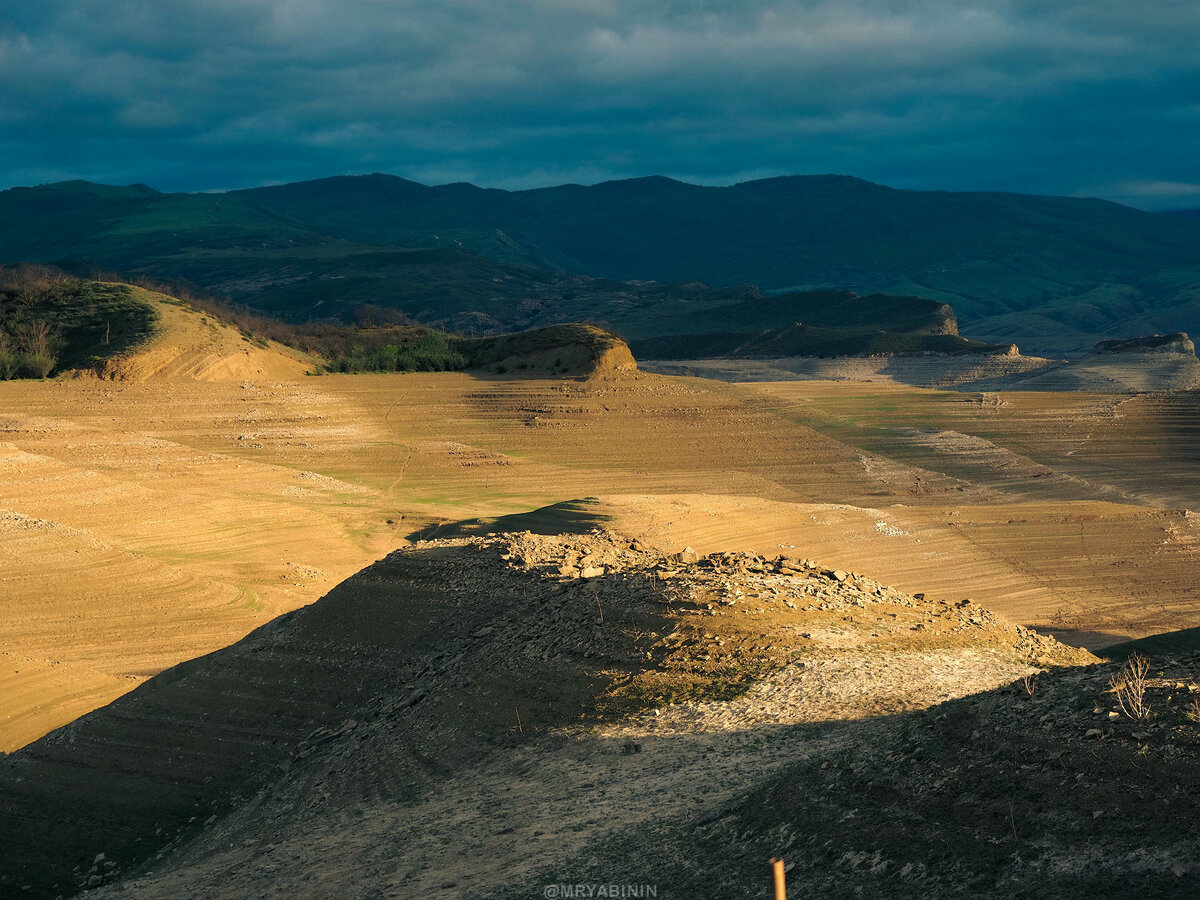 И чем ближе подбирается вечер, тем красивее становится долина Чиркейского водохранилища. Последние лучи солнца выхватывают причудливые образования, омытые и размытые рекой, исполосованные горизонтальными линиями уровней воды в водохранилище.