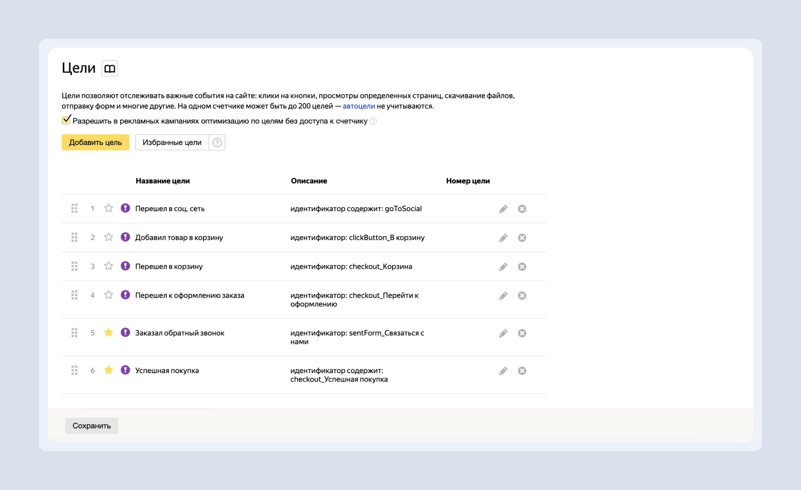 В интерфейсе Метрики появился инструмент «Избранные цели», который позволяет выбрать одну или несколько важных бизнеса целей. Общая статистика по ним будет автоматически отображаться в отчетах Метрики, благодаря этому анализировать эффективность трафика будет проще и удобнее.
