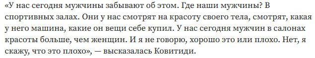 Я просто из деревни, я в спортивных залах, где все любуются своим телом, не бывал (а вот сенатор, видимо, бывала), а думал, там просто занимаются спортом. А про салоны красоты, где много мужчин, вообще не слышал. Видимо, это "что-то на богатом".