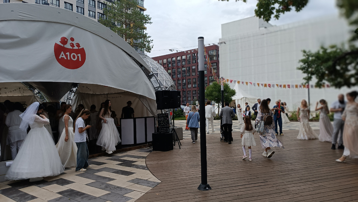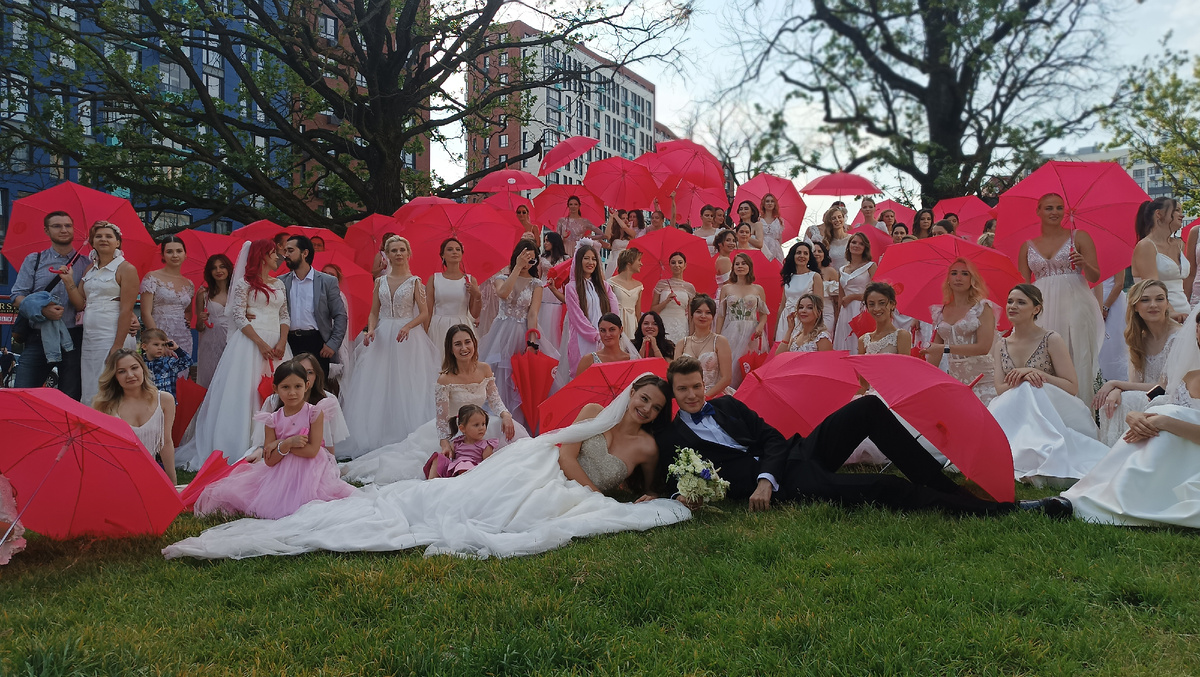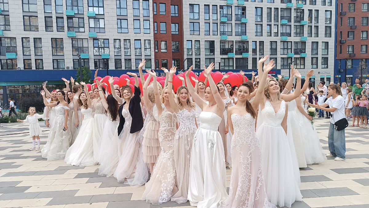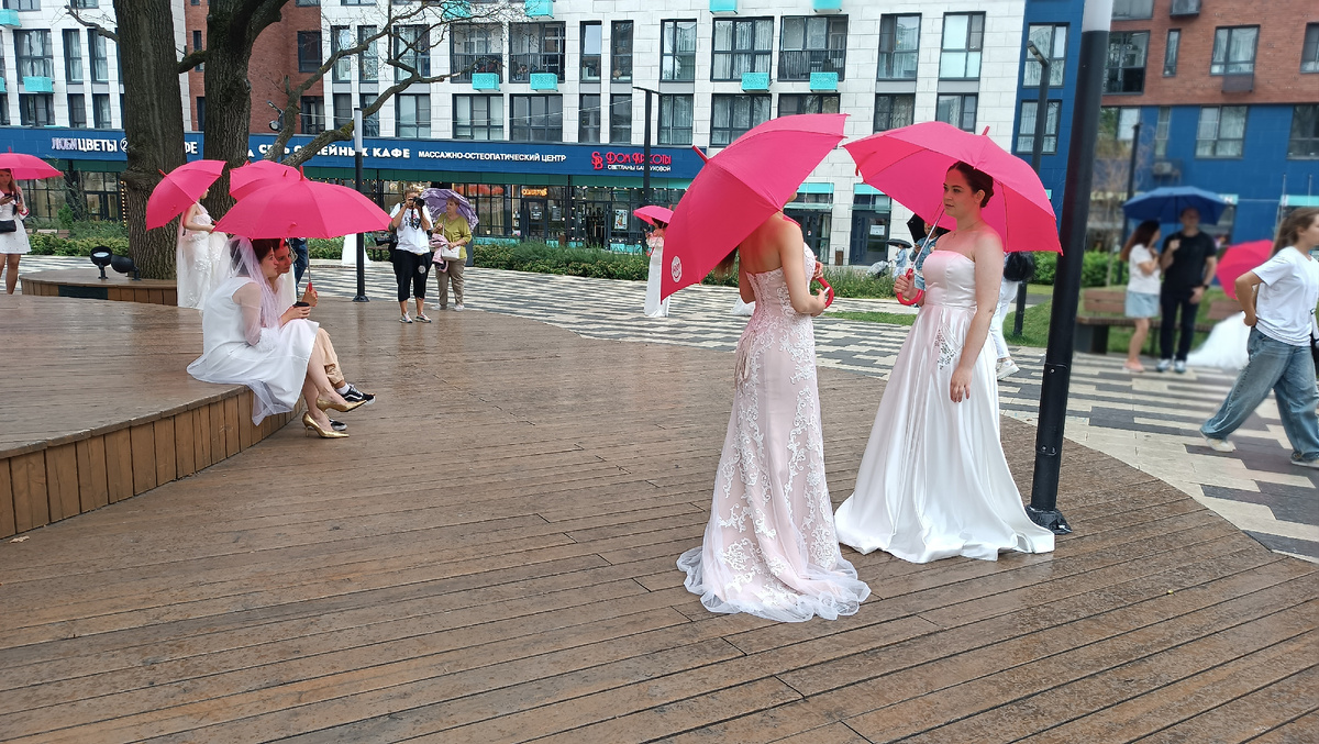 В Новой Москве в районе Скандинавия прошел парад невест. Мероприятие проводило группа компаний А101: красные зонты с их логотипом ярко пестрили среди белых нарядов.