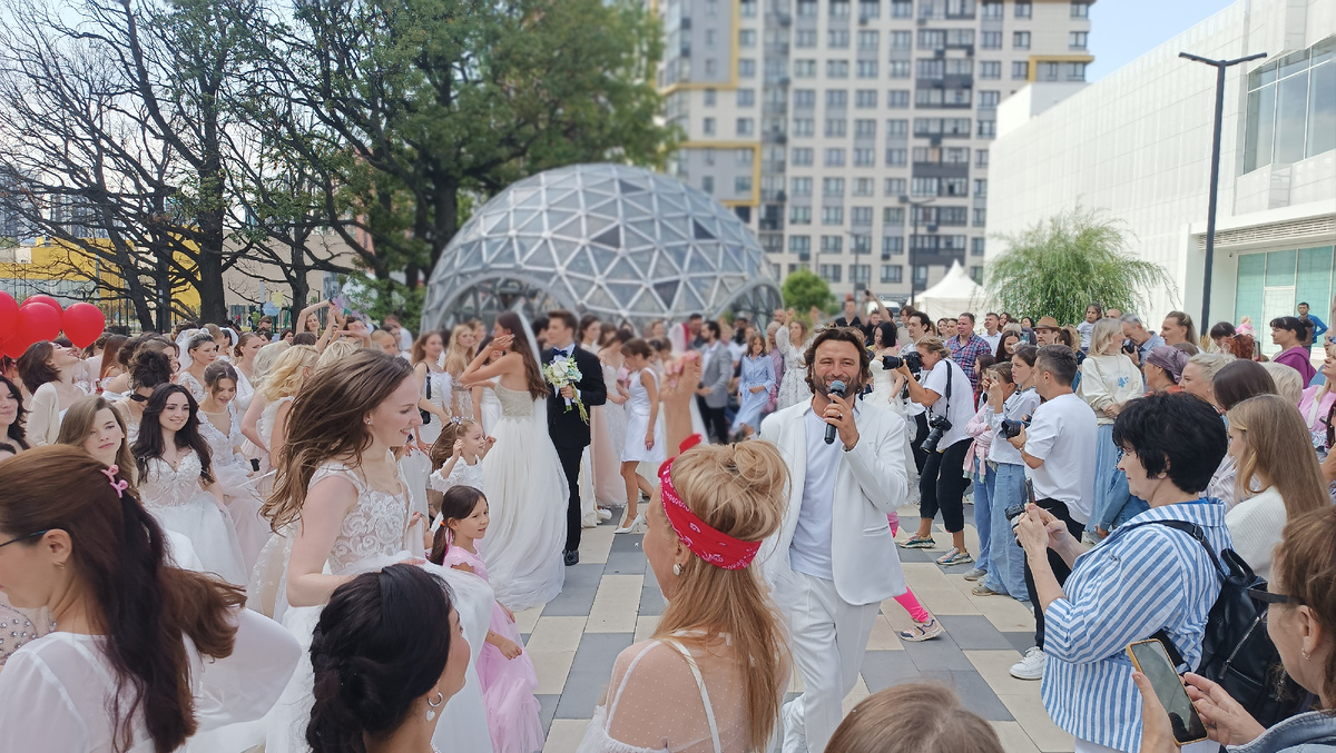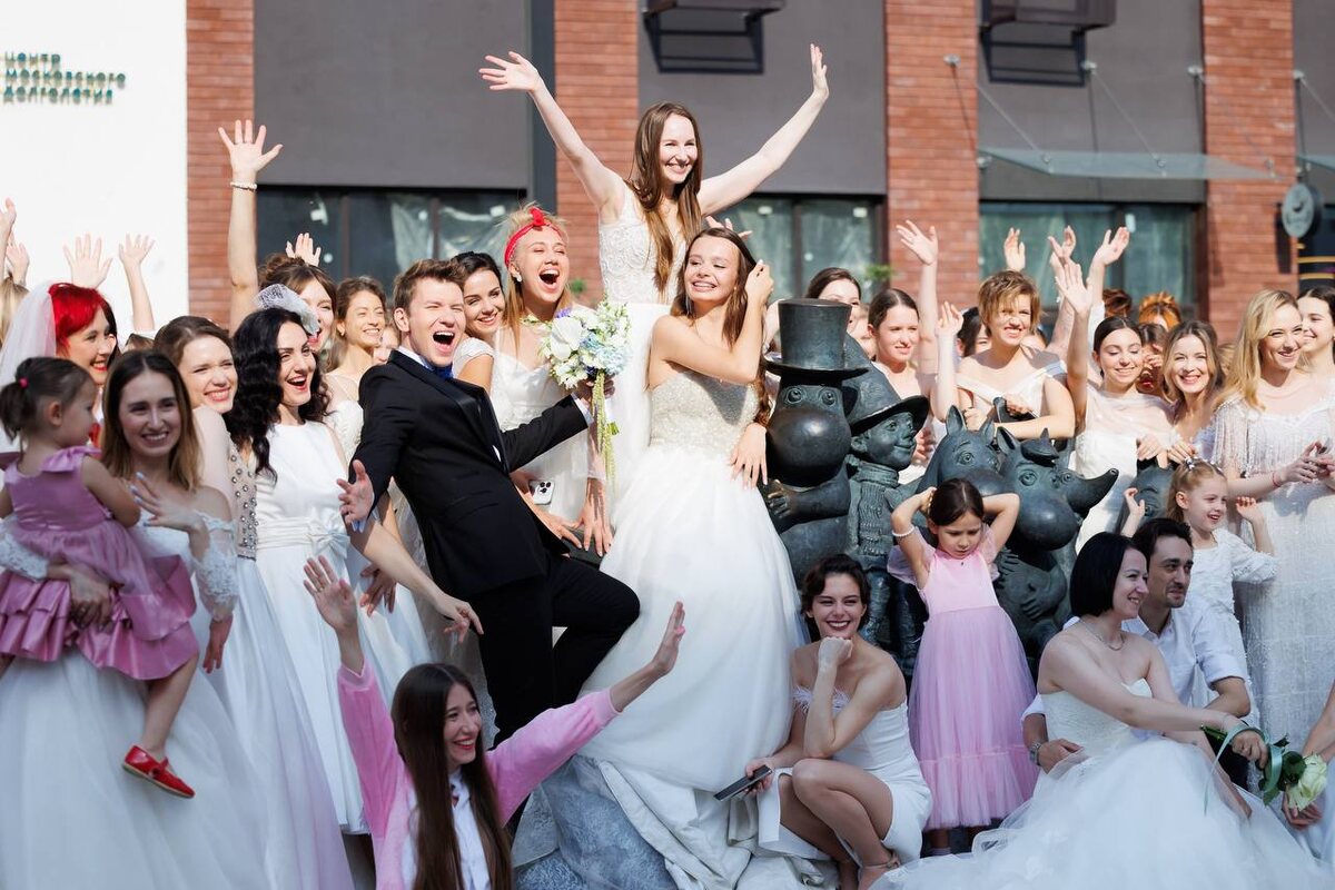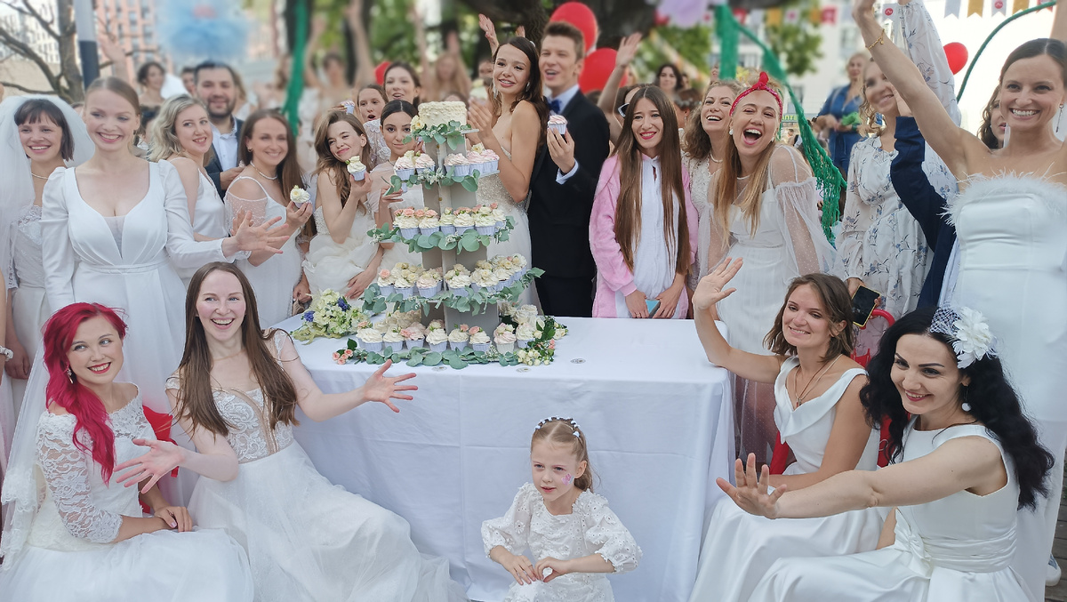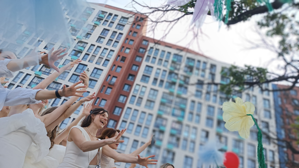 В Новой Москве в районе Скандинавия прошел парад невест. Мероприятие проводило группа компаний А101: красные зонты с их логотипом ярко пестрили среди белых нарядов.