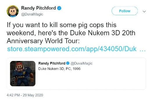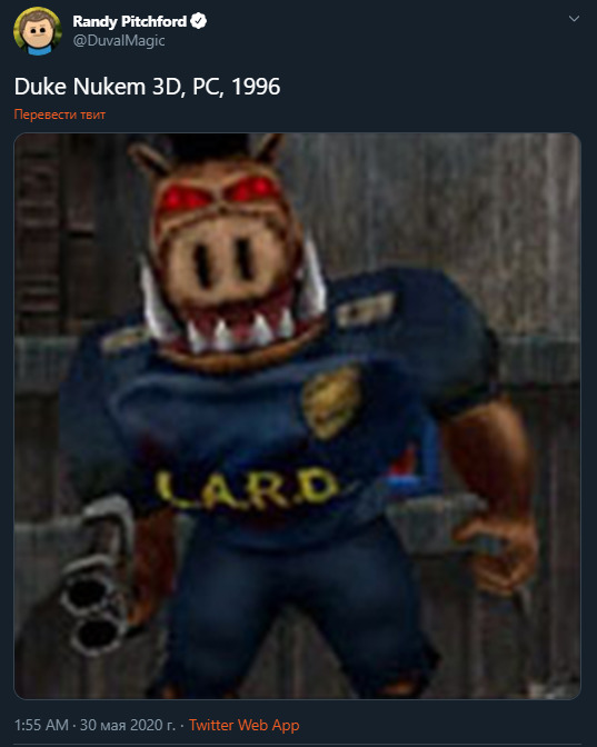 "Если вы хотите убить немного свинокопов на этой неделе, то для этого есть Duke Nukem 3D: 20th Anniversary World Tour", — написал глава Gearbox, приложив фото мутировавшего врага-полицейского из игры.