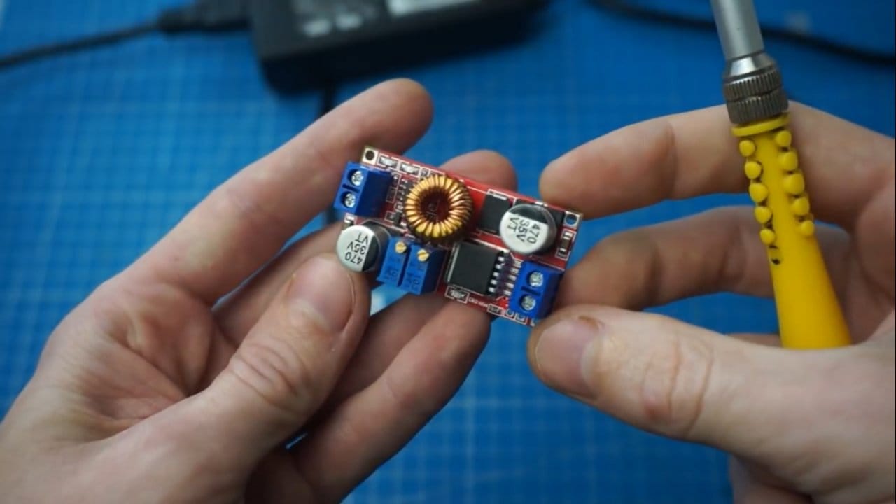 Сразу подключать аккумулятор не нужно, сперва необходимо настроить напряжение и ток на выходе платы DC-DC преобразователя под нужный аккумулятор.
