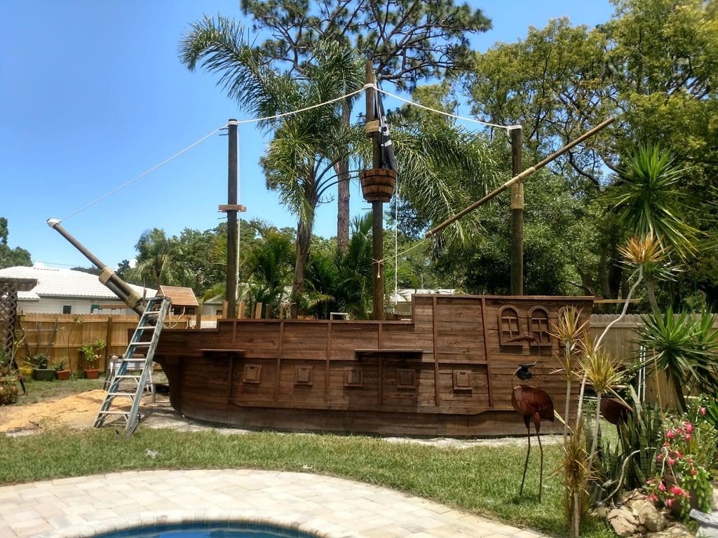 Если у вас на приусадебном участке или во дворе много места, то попробуйте украсить участок построив пиратский корабль, как это сделал мастер-самодельщик.