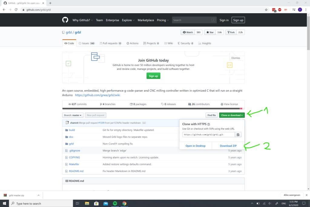 Перейдите на этот сайт: https://github.com/grbl/grbl и нажмите «скачать», затем нажмите «скачать ZIP».