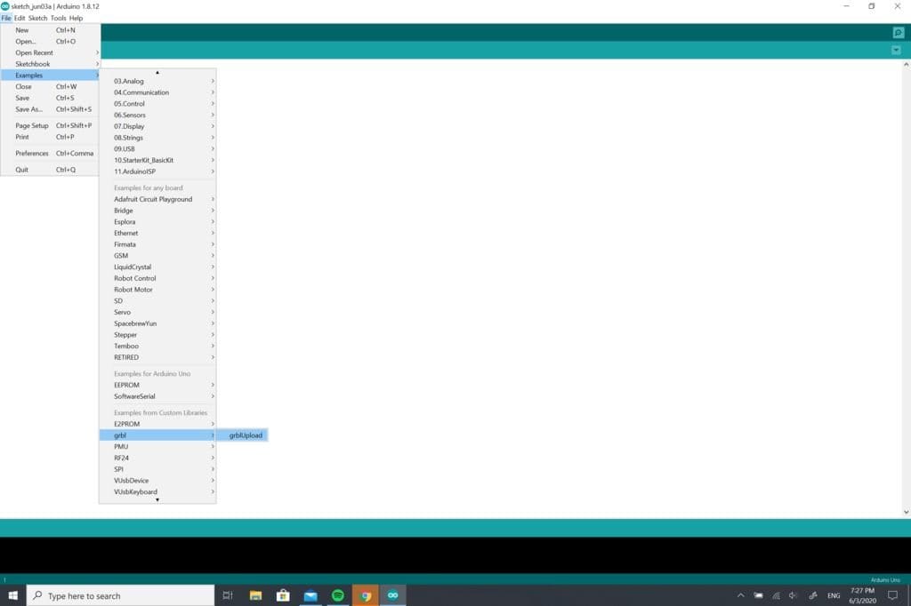 Перезапустите Arduino IDE и подключите USB-кабель устройства к компьютеру. После перезапуска IDE Arduino перейдите в File —> Examples —> grbl —> grblUpload.