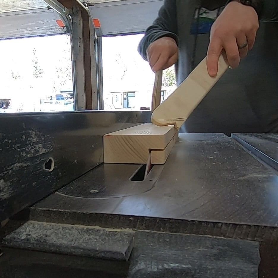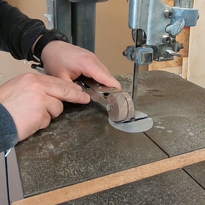Изготовить ручки было немного сложнее. Сначала мастер вырезал диски из толстого дерева. Затем на ленточной пиле обрезал и придал им форму ручки.
