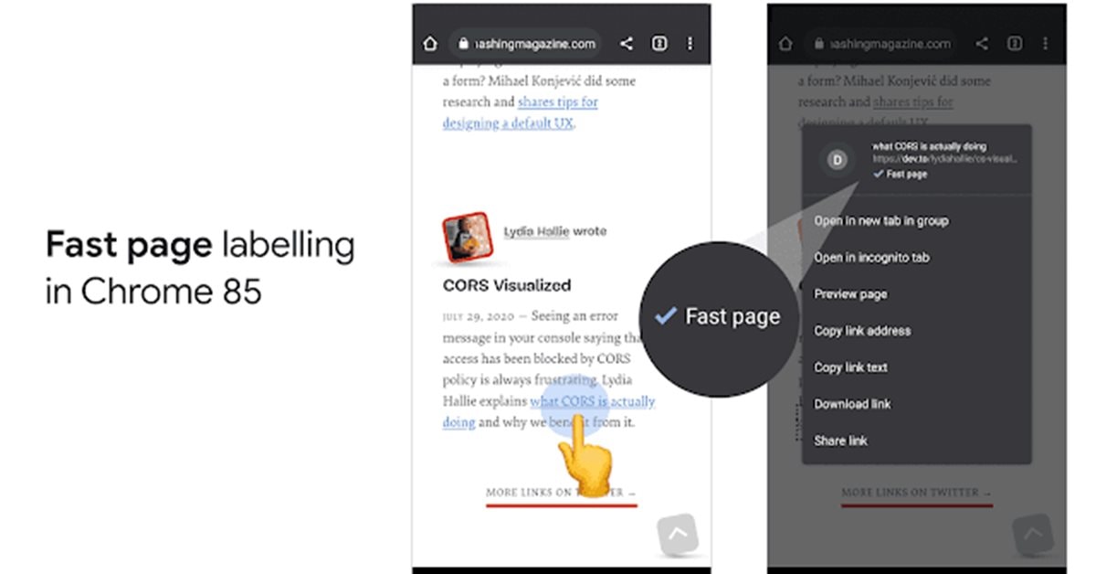 Google объявил, что браузер Chrome начнёт выделять страницы с хорошим пользовательским опытом знание (опыт) — совокупность знаний и умений приобретённых человеком в процессе взаимодействия с внешним по отношению к нему миром, а также в процессе собственных внутренних переживаний — вся в интернете. Первым этапом станет добавление ярлыка «быстрая страница» в контекстное меню для ссылок в Chrome на Android. Запуск этого изменения будет начат в Chrome 85 Beta.