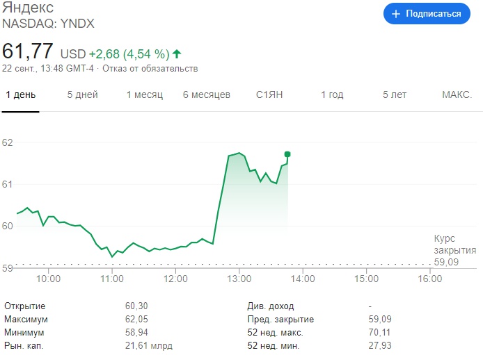 На фоне новости акции «Яндекса» на бирже организатор торгов товарами, валютой, ценными бумагами, производными и другими рыночными инструментами Nasdaq резко выросли в цене. За первые 25 минут после объявления о сделке стоимость экономическое явление, понятие которого имеет несколько разных определений бумаги волокнистый материал с минеральными добавками повысилась на 4,3% — с $59,2 до $61,70. На 20:48 мск цена акции составляет $61,77.