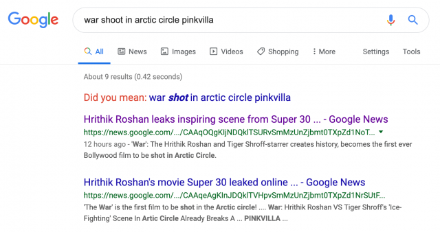 Пользователь Twitter Sanchit опубликовал скриншот поисковой выдачи по запросу [war shoot in arctic circle pinkvilla], большинство страниц которой были взяты из Google Новостей.