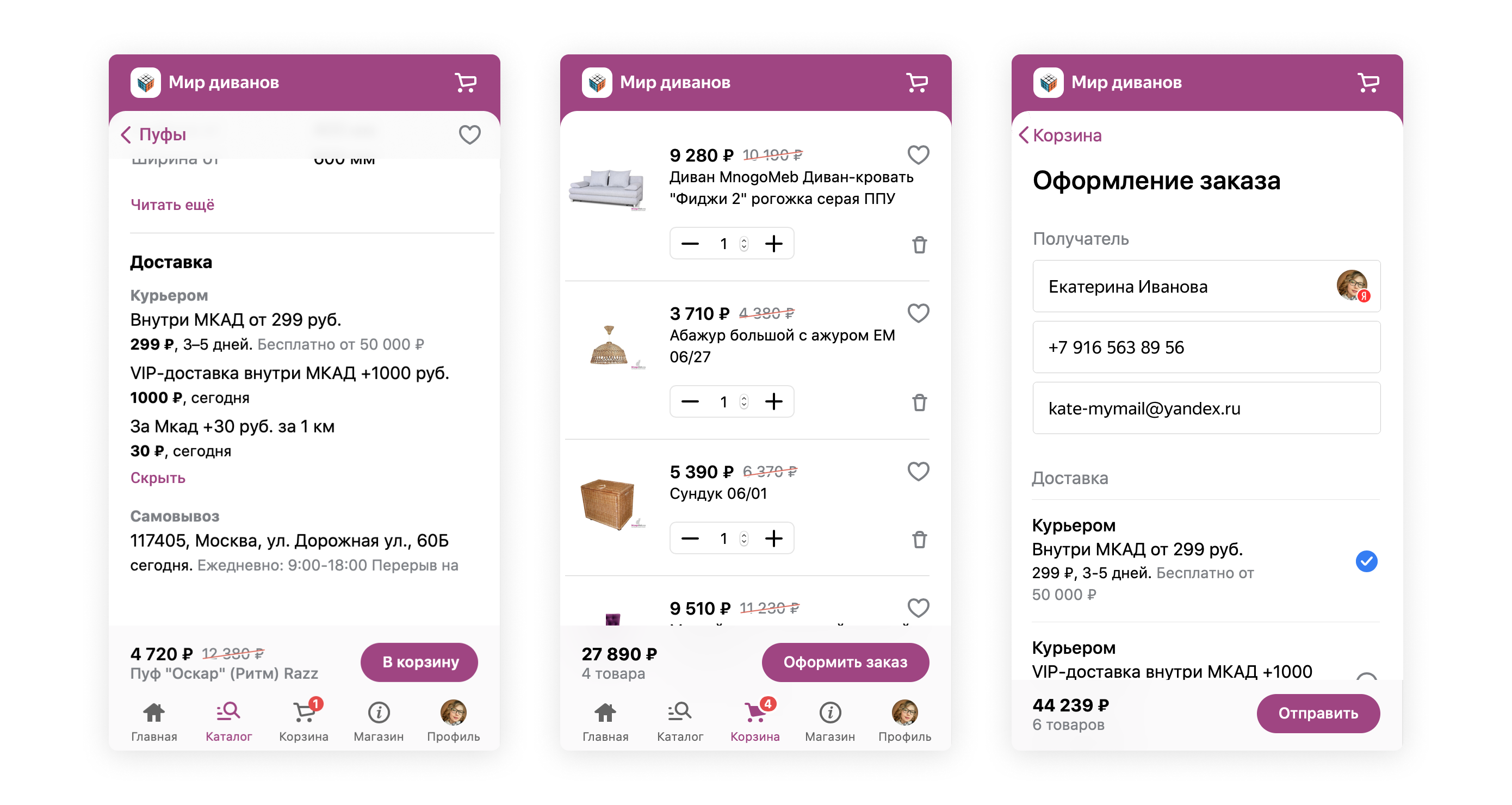 В карточке товаров доставке теперь уделяется больше внимания. Рекомендации отображаются в виде карусели, а доступ к корзине для покупателя доступен из любого раздела по кнопке внизу страницы.