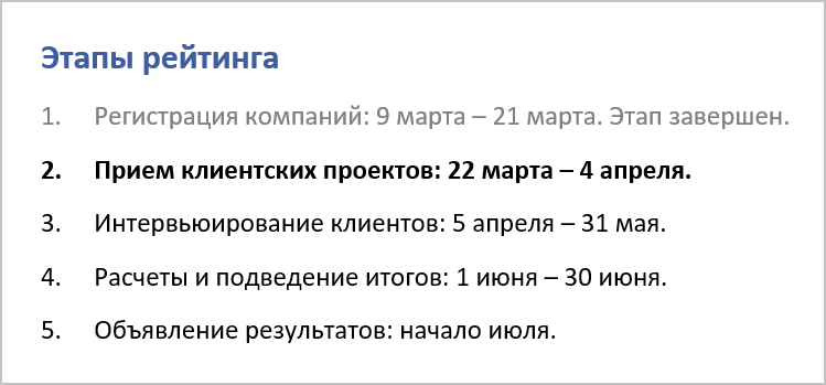 Мы перешли ко второму этапу рейтинга – сбору клиентских проектов от зарегистрировавшихся компаний.